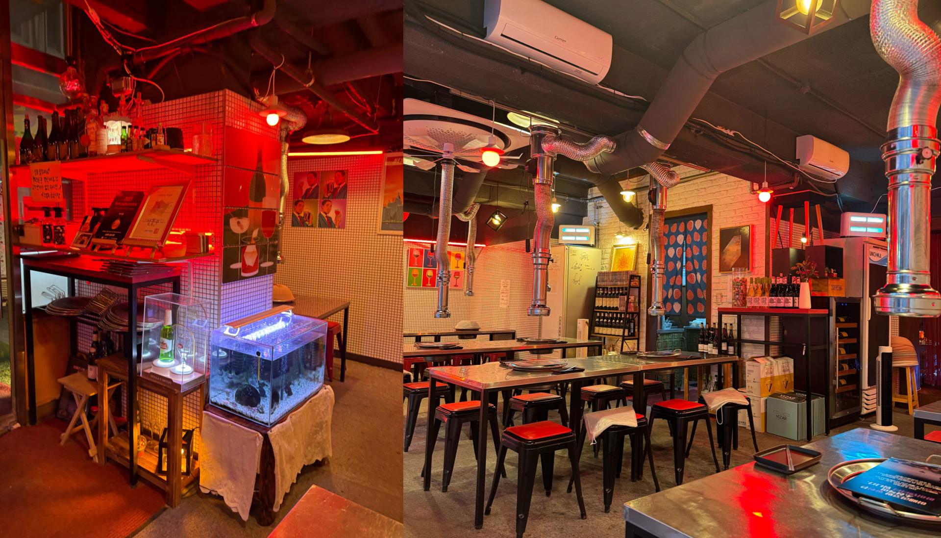 소설옥은 고깃집이라기보다는 와인 바 감성이 강한 공간입니다. 붉은 조명, 따뜻한 톤의 가구,
